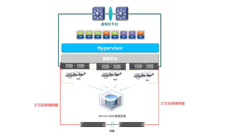 方案优势:通过运用超融合技术,整个云化数据中心会变得极为简单,不再需要那些复杂的硬件设备,只需要使用标准的X86服务器和通用交换机, 我们就能够以纯软件的方式构建一个功能完整、却架构极为简单的云数据中心。这样一来,数据中心建设的速度会更快、 日常运维会更加简单、故障恢复的时候也会更加及时,这些都是极为明显的好处。