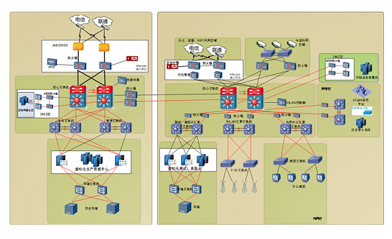 方案优势:双机堆叠大大提高了网络的可靠性,在增加链路带宽的同时还能有效的避免因单点故障造成的网络问题; 安全高效合规的网络安全域设计;多层次互联网出口网络安全架构接入模型及线路带宽标准化;保障网络安全、主机安全、应用安全、数据保安全、安全管理。